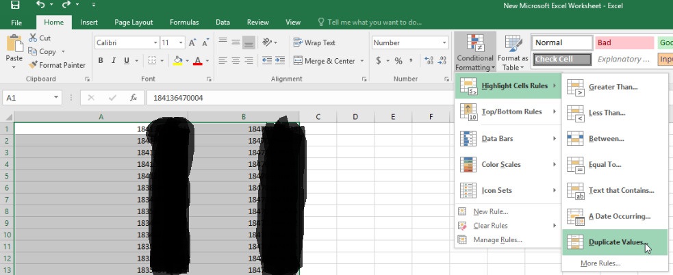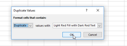 In Home choose “Conditional Formatting”-> “Highlight Cells Rules” -> “Duplicate Values”