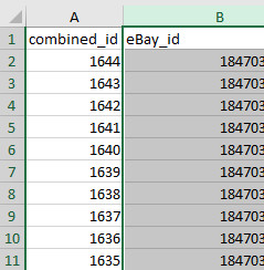 Create a new excel file, copy and paste 2 columns of eBay ID from 2 files from step 1 and 2.